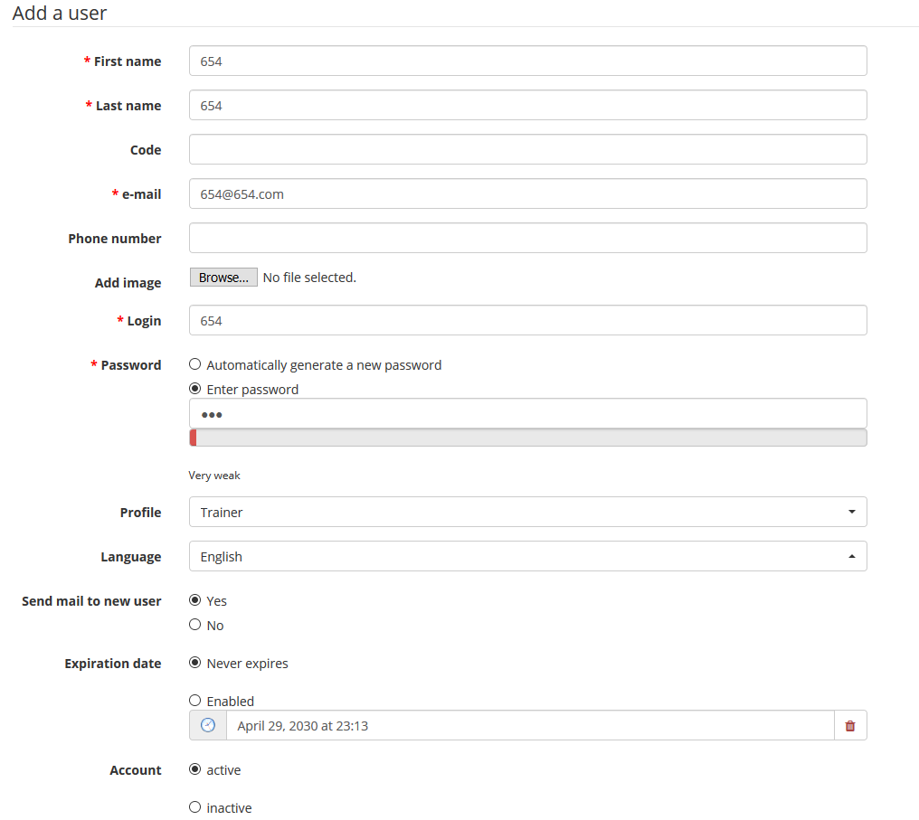 Create a new user has named ‘654’.